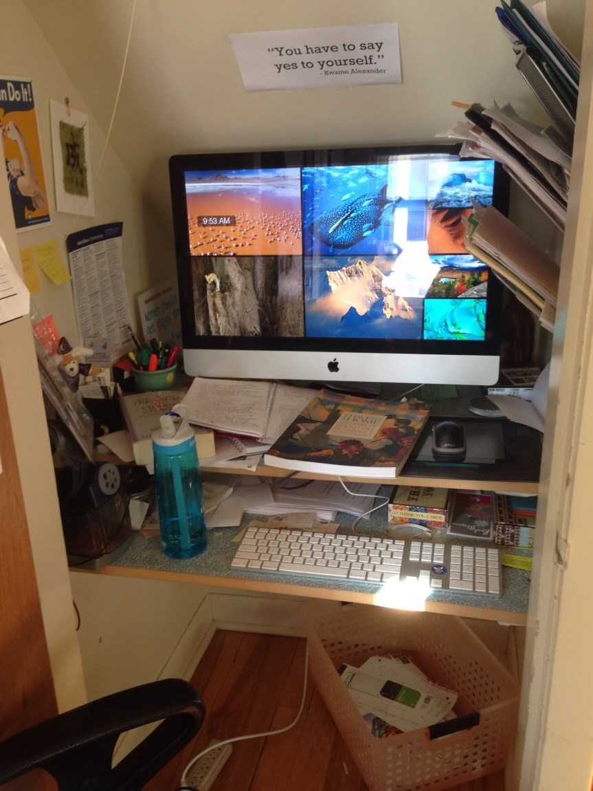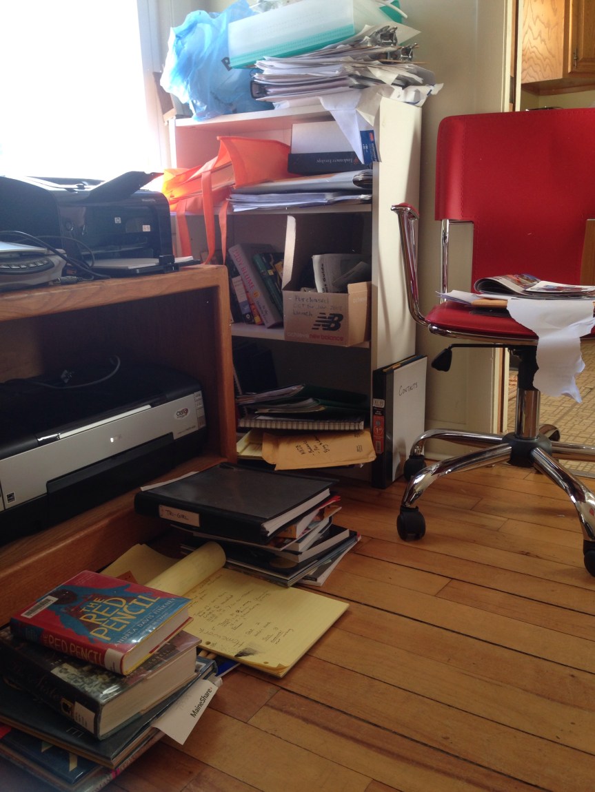 When they are not here, I try not to hold myself hostage to my good-girl proclivities. There’s no one to impress anyway and my writing is the most important thing. The mail stacks up along with the TBR (To Be Read) pile. Right now I’m starting a new writing project so my resource books and notes, journals and plotting tools litter my tiny desk. I eat in front of the TV at night and binge on House of Cards while tweeting and checking in on Facebook friends to relax .