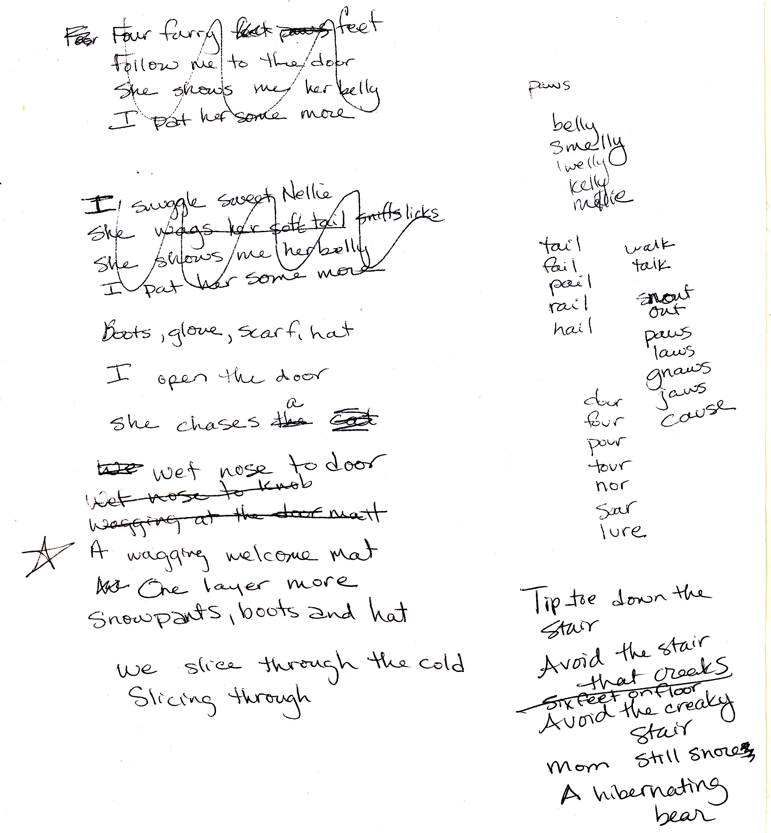 At this point I’ve struck the pieces that are holding back the poem. I created a whole story here. Is it really necessary, I ask myself, all this build up? I really love the image of the moon in the first stanza, I can skip the kid and dog going down the stairs and getting ready to go outside if I trust that the reader knows a child wouldn’t be out in the snow in their PJ’s. Also, the piece about Nell already having her coat is a little inside joke to myself and a homage to Else Holmelund Minarik’s, “What will Little Bear wear?” The next stanza brings the child and dog outside, and I also like the imagery of a sparkle show. What if I turned those couplets around in order? Then the transition from night to day, inside to outside, calm to play might work better.